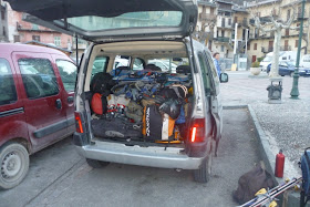 Vous avez déjà essayé de faire rentrer dans 4 véhicules : 14 jeunes et leurs sacs, 4 chauffeurs et leurs affaires, 7 luges, 7 paires de ski de rando, 7 paires de ski de piste, des crampons, des piolets, des cordes, des casques, des baudriers, des chaussures de ski et d'alpinisme et encore quelques autres affaires. Croyez nous, il faut bien choisir les voitures et être expert en tétris, mais ça rentre.