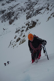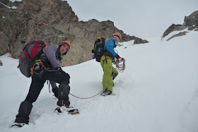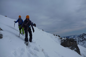 Une montée qui par des conditions de trace physique s'avèrera fatale au mental de la célèbre gnac de crocmontagne, une gnac qui devait être tout aussi enfouie que les crampons des traceurs. Une montée qui est une succession de couloirs larges et moyennement raides mais qui débouche sur une arête dégagée.