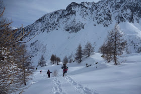 nous sommes partis en raquette de Castérino pour le refuge de la Valmasque, on a du faire nos traces, personne n'était passé, après