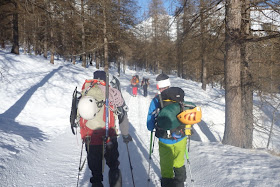 Nous voilà ainsi dans le sens inverse de nos traces de la veille, tantôt sur les fesses, il y eut beaucoup de glissades, tantôt en raquettes le chemin du retour sera bien moins éprouvant que la veille, même si certains adultes ont essayé de m'attaquer au moral...