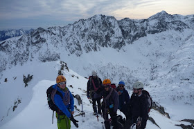 Un soleil rougeoyant se lève par dessus le Paracouerte, nos yeux ont bien du mal à capter toutes les nuances de ce magnifique spectacle que nous offre ce réveil en Valmasque. Enfin trêve de poésie le P'tit déj, des petits pains au Nutella solide, vite conclu, la troupe part scindée en trois cordées en direction de la Charnassière très beau sommet, qui offre des possibilités aux skieurs les plus téméraires.