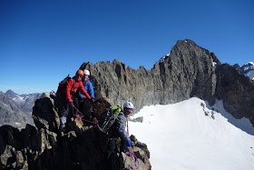 Après 1h00 d'approche, on est arrivé au glacier au lever du soleil. Le paysage, les couleurs, nous ont récompensé de nos efforts. Magnifique. Arrivés en haut du glacier (col su Sélé), nous devions monter au sommet (Bœufs rouges) sur une arête étroite et instable.