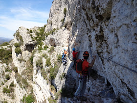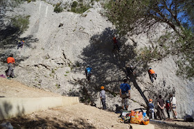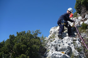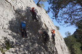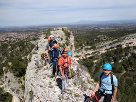 nous avons retrouvé quelques jeunes du club de St Rémy avec qui nous avons passé l'après-midi. Nous nous sommes scindés en deux groupes. Les plus grands sont partis avec Yann, Vincent et Pierre (président du club local Roc Alpilles) pour faire une randonnée aventures sur les crêtes du Mont Gaussier, même s'il n'y avait rien de dur pour nos grimpeurs aguerris, le rappel final a surement laissé quelques souvenirs émus à tout le monde.