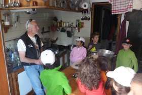 Arrivée au refuge pour le pique-nique, l'après-midi sera l'occasion de "visiter" la cuisine de refuge. Visiter est un bien grand mot vue la taille de la cuisine, mais cela a permis à tous, petits et grands de découvrir les conditions de travail de Michel et son équipe. Tout tient dans une douzaine de m², plonge, piano, plan de travail, vaisselle et malgré cette étroitesse, le cuisinier arrive à nourrir et servir jusqu'à 65 personnes, c'est tout une organisation. Pour nous la visite n'a pas été très facile tellement le Tajine de Mouloud, cuisinier pour la journée, parfumait la pièce.
