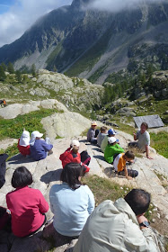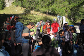 Nous nous sommes tous retrouvés au niveau du point de ravitaillement du refuge. Là, Alex a expliqué comment se passait un portage, comment Michel, le gardien, acheminait les vivres jusqu'au refuge, ici c'est du multi modal. L'hélicoptère en début de saison pour tout le sec, les ânes une fois par semaine pour une partie du frais et à dos d'homme pour le reste.