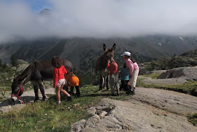 Avant de nous mettre en route nous avons attendu Alex, ânier de son état qui fait une fois par semaine un portage pour le refuge. Cette première rencontre a été l'occasion pour Alex de nous présenter Caboche et Babouche, les deux ânes avec lesquels il travaille sur ce portage. Il a fallu charger les ânes en veillant à ce que les charges soient bien équilibrées. Aujourd'hui point de ravitaillement mais une grosse partie du matériel dont nous aurons besoin dimanche pour les différents ateliers au programme.