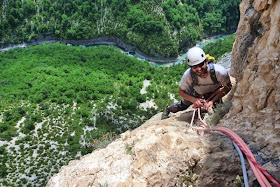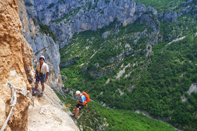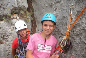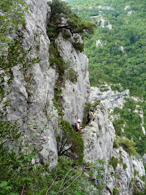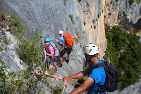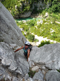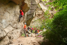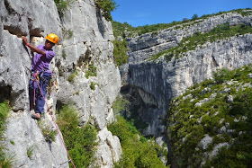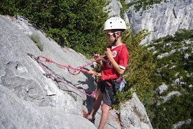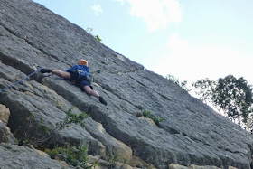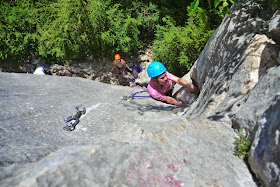 Sous la pluie mais à l'abri du dévers du site de dry du Fayet nous avons pu voir les stagiaires évoluer dans des longueurs d'artif, l'occasion de réviser tous les éléments relatifs à la pause de protection en rocher.
