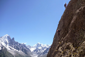Un petit retour en vallée, histoire de refaire le plein de provisions et d'envisager la suite du programme. C'est aussi l'occasion d'aller faire une voie dans les aiguilles rouges. Comme d'habitude 2 groupes de 2 cordées. Avec Yann dans "les dalles brunes" et Philippe dans "Mani Puliti" avec un œil dans "Nez Rouge" juste à côté.