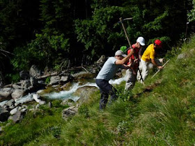 Après une présentation de la manifestation et de l'historique du sentier, deux équipes se sont mises au travail. La première armée de pioches et de pics est allée gratter la terre histoire de remettre le sentier d'aplomb, la seconde : "les petites mains" a désherbé, cairné, coupé les branches qui gênait le passage bref a arrangé le chemin. Les équipes furent tellement efficaces que le tronçon envisagé pour la journée ne nous a pris que la matinée, du coup nous avons pu poursuivre sur l'ensemble de l'itinéraire avant que la pluie ne s'invite à la fête.