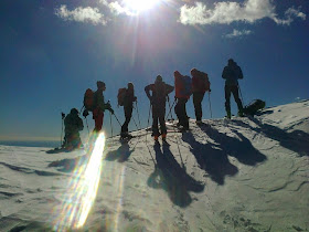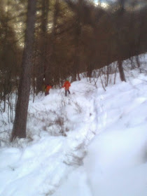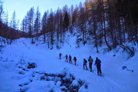 La fenêtre météo prévoyait du beau le matin et le retour de la neige en fin d'après midi. A croire que la perturbation avait quelques heures d'avance. Nous avons fait la route sous un grand ciel bleu, avons chaussé les crampons sous ce même ciel, mais à peine avons nous attaqué que les premiers flocons tombaient. Ce n'est pas encore pour cette fois que Claire fera de la cascade au soleil.