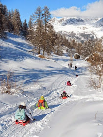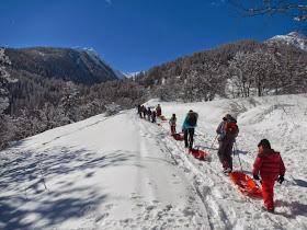 Les premières pentes seront faites en file indienne, chacun tenant la luge qui est devant la sienne. Un petit train qui se met en route.