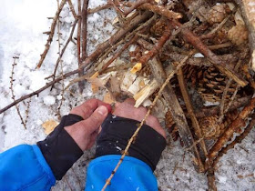 Sous la neige qui tombe toujours, certains profitent d'une pause « réchauffement » entre deux ateliers grâce à un petit feu allumé par des âmes bien intentionnées soucieuses du confort de tous ces champions !
