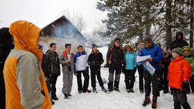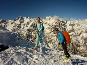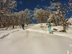 Nos jeunes ont les crocs, chacun veut faire sa trace et dans cette neige toute fraîche ça demande une sacrée énergie. Une pause sur la crête après 800m de dénivelé, le soleil est de la partie et deux irréductibles décident qu'ils iront au bout, encore 150m de déniv et 30minutes pour 5minutes de descente avant de reconstituer le groupe et de rattraper les autres groupes dans la descente.