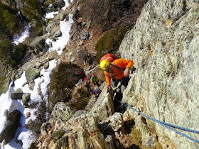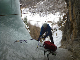 Mardi, nous quittons le Queyras et filons du côté de Fressinières et du Fournel. Fabien, Claire, Fabrice, Vincent Sébastien et Mathilde tenteront le coup au Fournel, mais les conditions de glace étaient vraiment mauvaises pour envisager de faire la cascade prévue (Les visions de Marco) sereinement. Pas grand chose d'autre à se mettre sous les piolets à proximité immédiate, c'est donc vers l'éperon Bouchier qu'ils se tourneront. Avec ses stagiaires, ils n'ont pas perdu leur journée et sont donc allé, en grosses chaussures, grimper sur le cailloux.