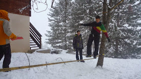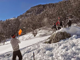 Jordi est revenu avec les ados. Il est littéralement pris dans une rafale de boules de neige joyeusement lancées par ces montagnards en herbe apparemment pas encore fatigués de leurs efforts de la journée.