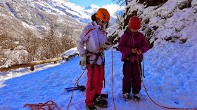 Samedi, après la route et une introduction sur le séjour, où on a pu faire le point le matériel adapté à la progression en cascade, la manière de le ranger. Nous avons abordé des notions comme l'effet poulie ou le facteur de chute. Ensuite rien de tel que la pratique avec la prise ou la reprise de sensations. Nous avons porté une attention particulière à l'équilibration des stagiaires pour pouvoir envisager le brochage et le débrochage dans de bonnes conditions.