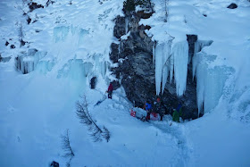 Avec les 15 glaciéristes en herbe, nous nous sommes rendus sur la cascade des Claux à Pelvoux. Les conditions de ce dimanche étaient optimales pour une première initiation : grande beau, un soleil qui inonde le pied de la cascade et la zone de pique-nique sans trop ramollir la glace, une petite couche de neige qui facilite les ancrages dans les zones peu raides, une cascade pour nous tout seul. Il ne nous en faut pas plus pour poser 5 lignes allant de la pente de neige entrecoupée de quelques ressauts de glace à des sections de glace verticale. Tous les jeunes s'essaient à l'activité certains trouvent ça tellement bien qu'ils enchaînent toutes les lignes. Après un pique nique au soleil, les fesses au sec, certains ont même grimpé en tête avec les broches en place.
