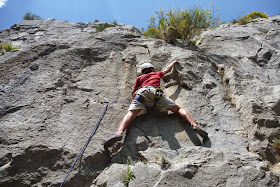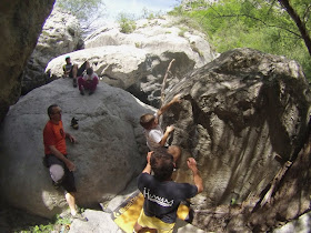 Samedi, Philippe nous a rejoint avec 3 nouveaux jeunes pour faire du bloc le long de la rivière, ne contre bas de là où nous étions la veille. Un peu plus tard en saison nous aurions même pu nous passer des crash pads pour certains blocs l'eau faisant office de matelas. Le bloc est une discipline difficile. Les mouvements bien plus intenses que la falaise demandent souvent du travail avant de pouvoir être réalisés et là, les prises ne sont pas indiquées par des couleurs, il faut d'abord les trouver, imaginer les mouvements et ensuite tenter de réussir l’enchaînement de ces derniers. Le soleil dardait dans le ciel mais nous étions au frais au bord de l'eau, c'était le top.