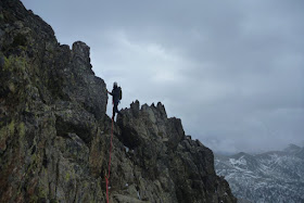 Quelques gouttes de pluie à l'avant dernier relais nous ont fait nous poser quelques questions surtout que la dernière longueur nous réservait encore quelques surprises, un joli dièdre à remonter en dulfer avec des pieds pour le moins lisses, heureusement que la pluie ne s'est pas montrée trop insistante.