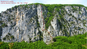 Vendredi nous étions 6, 3 adultes et 3 jeunes pour aller faire un tour dans la grande voie classique du "Paretone di Loreto". Verdi Colline d'Africa est une ligne logique où se succèdent des petits pas de dalle et de jolies fissures. Tout le savoir faire gestuel a du être sorti pour venir à bout des 170m.