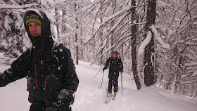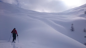Mardi, nous sommes les seuls à rester, les autres étant partis la veille. Nous formons deux groupes : les trois plus motivés et pas trop malades ressortent leurs skis de rando pour un petit tour du côté de la tête d'Oréac depuis Prey d'Aval. Il a fallu combiner puisqu'il n'est pas toujours facile de trouver chaussures et skis en petite taille. Liv, qui voulait vraiment s'essayer au ski de rando pour ses 10ans aura fait la sortie avec ses chaussures de ski de piste et des skis un poil trop grands. C'est beau la motivation.