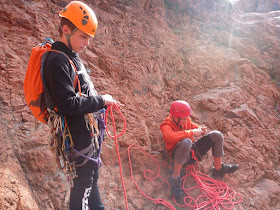 Direction donc Le Trayas avec Axel, Nils, Seb et Jochen. Après 2 heures de route c'est la ryolithe de l'Esterel qui nous accueille. Le départ se situe à quelques minutes du parking et c'est vraiment au-dessus de la mer que nous commençons à grimper. Comme nos deux aventuriers sont déjà bien "dégrossi" on décide de faire une cordée d'adultes et une cordée de jeunes. On part devant et on se fait suivre par les jeunes histoire de vérifier qu'ils ne fassent pas n'importe quoi.