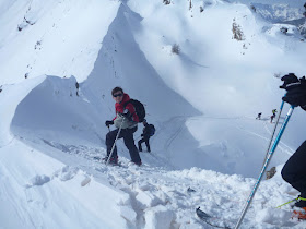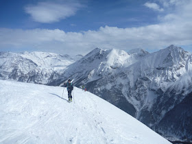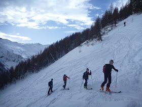 Comme nous devions récupérer Adrien à Oulx, nous en avons profité pour faire un arrêt du côté de Bardonnecchia. Bien nous en a pris. Un rapide coup d'oeil à la carte nous fait pré-sentir qu'il y a peut-être un coup à jouer entre les 3 croce et les 4 soeurs. Nous n'avons pas été déçu, loin de là. Nous avions peur de trouver une neige lourde à cause des températures élevées et bien pas tant que ça. Dans le bas de l'itinéraire on n'était pas dans de la neige de rêve mais plus on montait, plus nos yeux avaient du mal à y croire. Pas une trace, un manteau parfaitement vierge, et une neige de plus en plus légère malgré l'heure avancée.