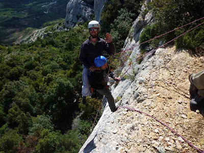 Le Mardi 21 mai : On reste sur la Montagne Sainte Victoire direction le secteur de la Carrière. Cette fois les voies sont un peu plus courtes (5 longueurs tout de même) pour nous permettre d'avoir encore du temps dans l'après-midi pour refaire des ateliers en paroi (confection du point d’ancrage des rappels, déblocage d’un grimpeur coincé sur un rappel, retraite avec blessé, remontée de corde). Les stagiaires se répartiront dans les voies suivantes : 133 Oeillets, Dullisa, Les Ancêtres, et l'Ananas voie comportant une longueur d'artif (A1). Dans la fin des voies c'est l'occasion de mettre en oeuvre une progression simultanée, puis de descendre dans du terrain moyen (tracé vert du Pas du Clapier).